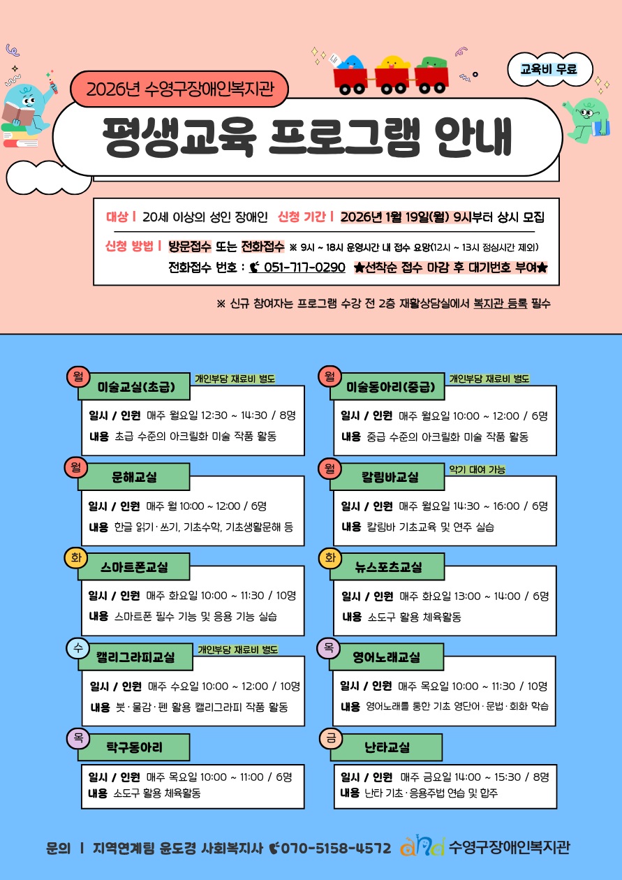 ○ 신청대상: 20세이상의 성인장애인, 복지관 이용인 ○ 신청기간: 2026년 1월 19일(월)부터 (선착순)상시모집
