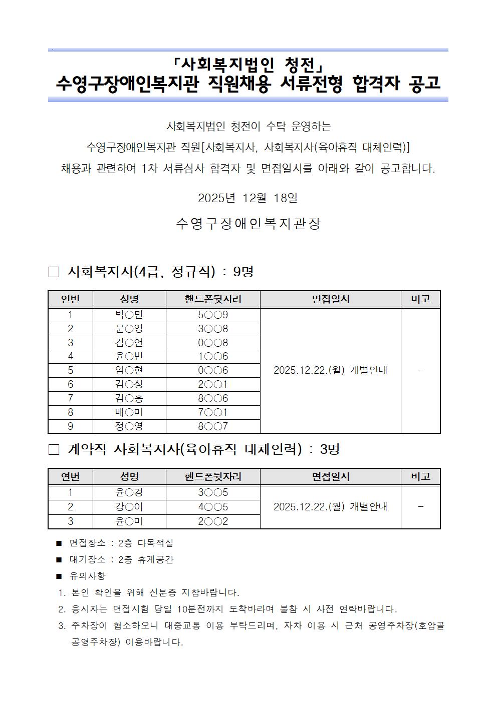 수영구장애인복지관 직원(사회복지사 및 사회복지사 육아휴직대체인력) 공개 채용 1차 서류전형 합격자 및 면접자 공고