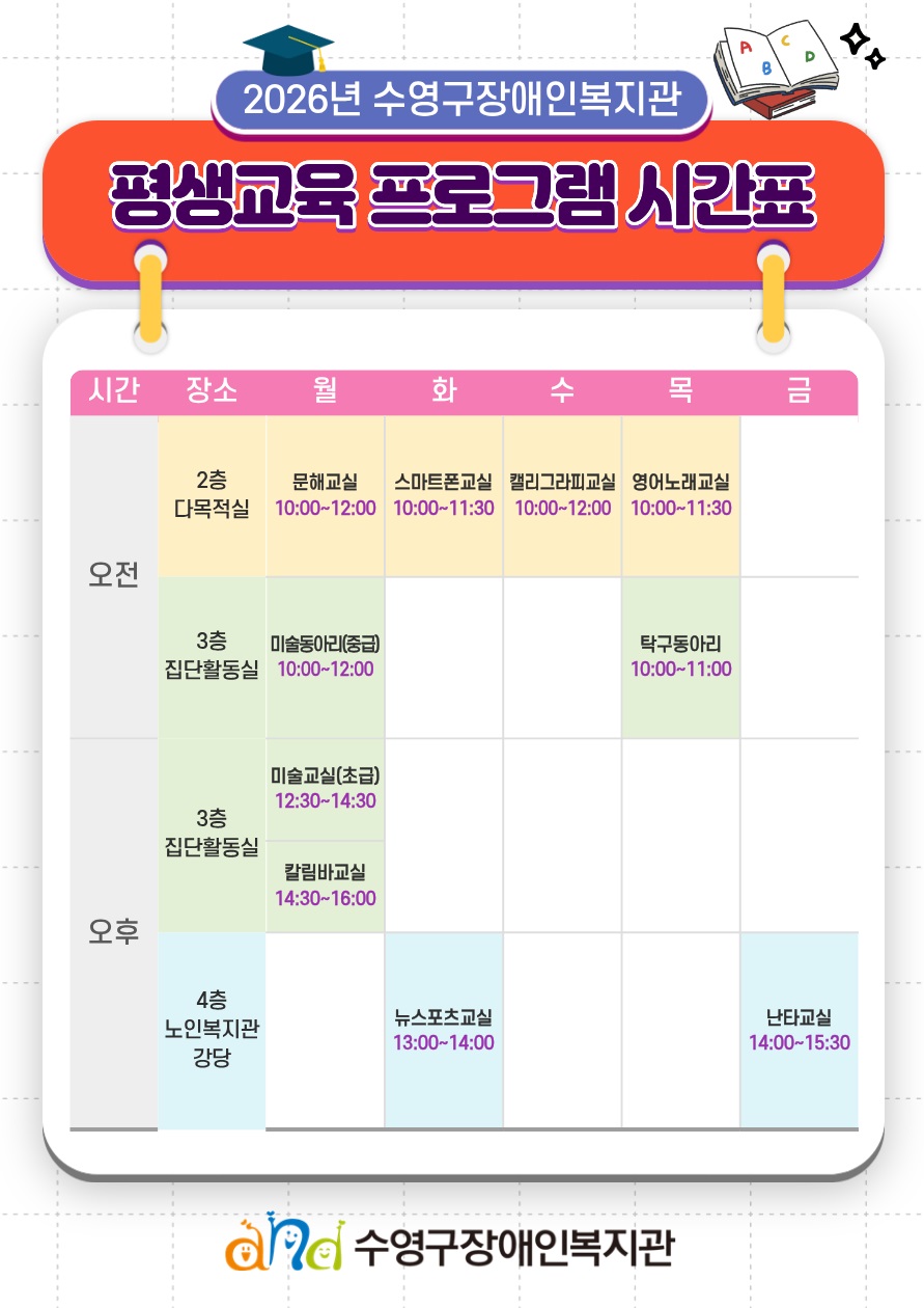 ○ 장소: 수영구장애인복지관 (별도 프로그램은 장소 다를 수 있음)