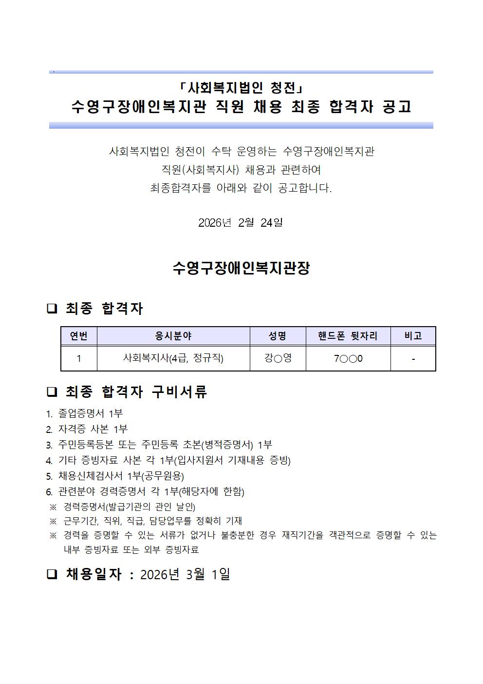 수영구장애인복지관 직원(사회복지사) 공개 채용 최종합격자 공고